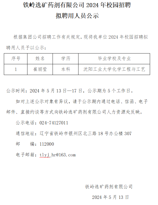 鐵嶺選礦藥劑有限公司2024年校園招聘 擬聘用人員公示