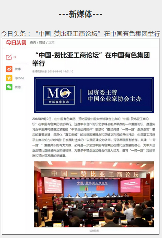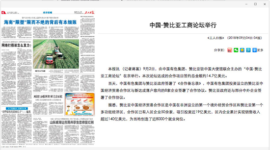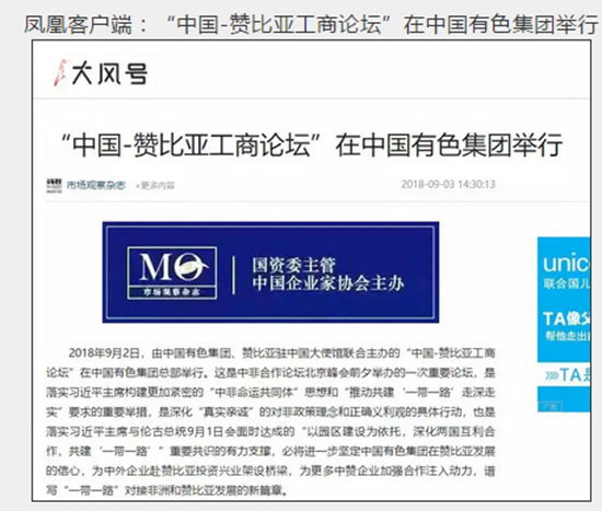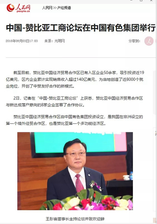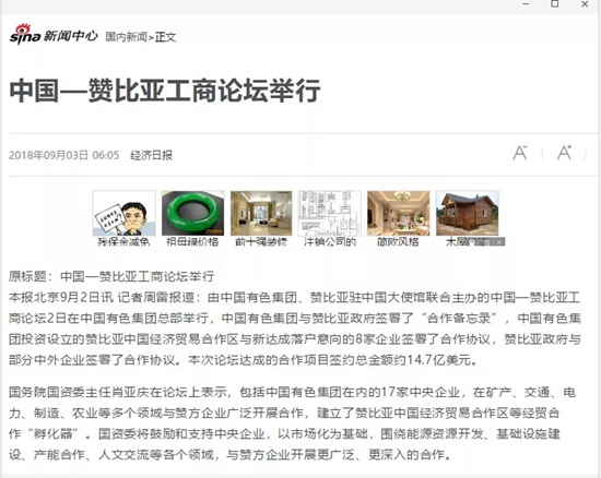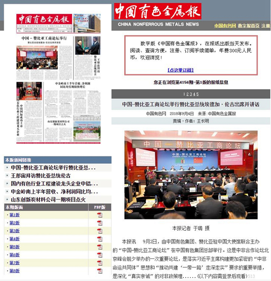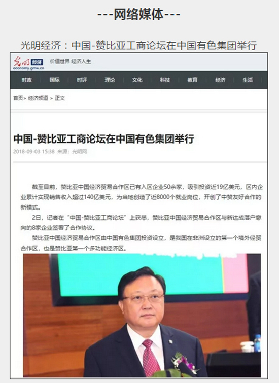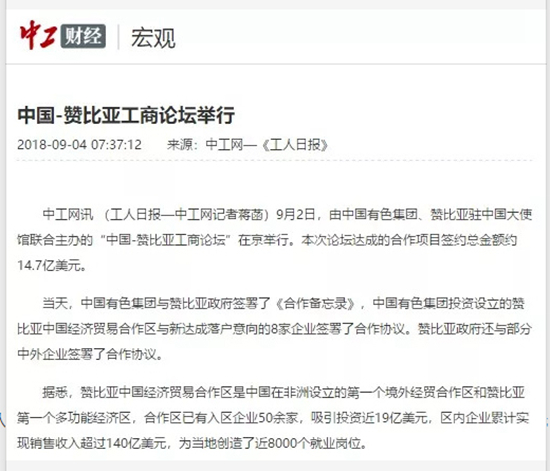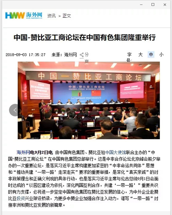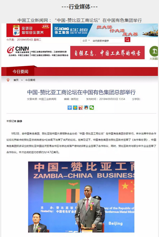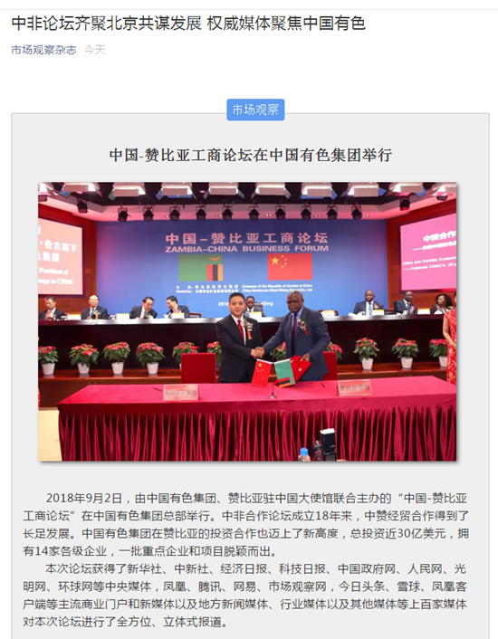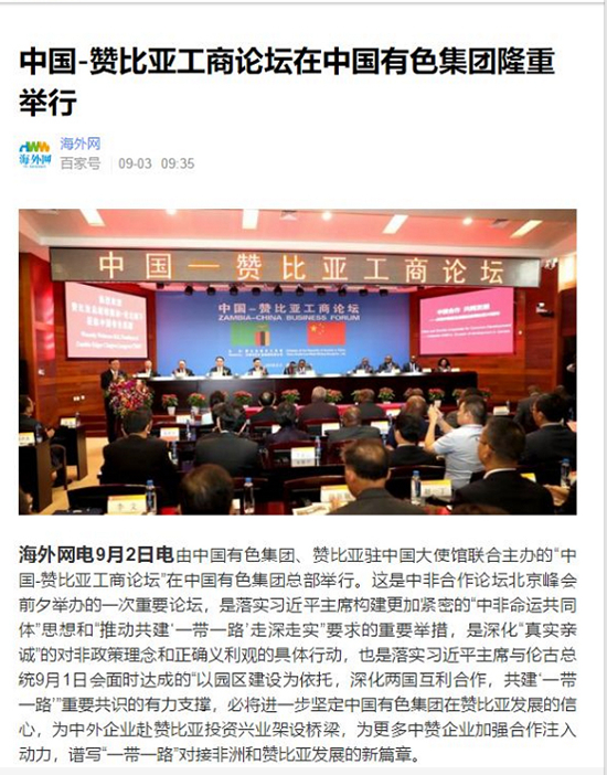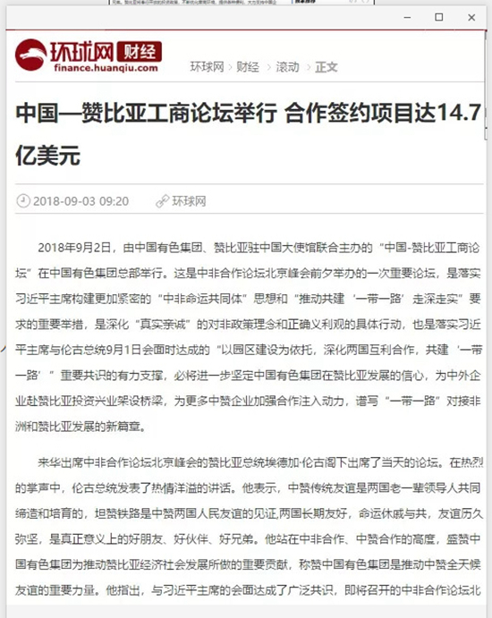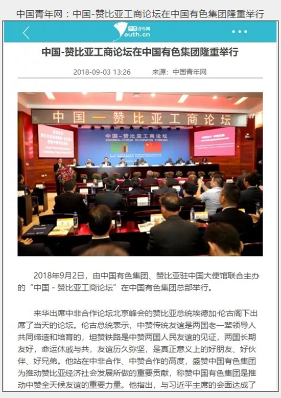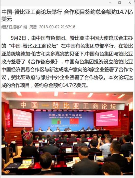 2018年9月2日,由中國有色集團、贊比亞駐中國大使館聯(lián)合主辦的“中國-贊比亞工商論壇”在中國有色集團總部舉行。中非合作論壇成立18年來,中贊經(jīng)貿(mào)合作得到了長足發(fā)展。中國有色集團在贊比亞的投資合作也邁上了新高度,總投資近30億美元,擁有14家各級企業(yè),一批重點企業(yè)和項目脫穎而出。