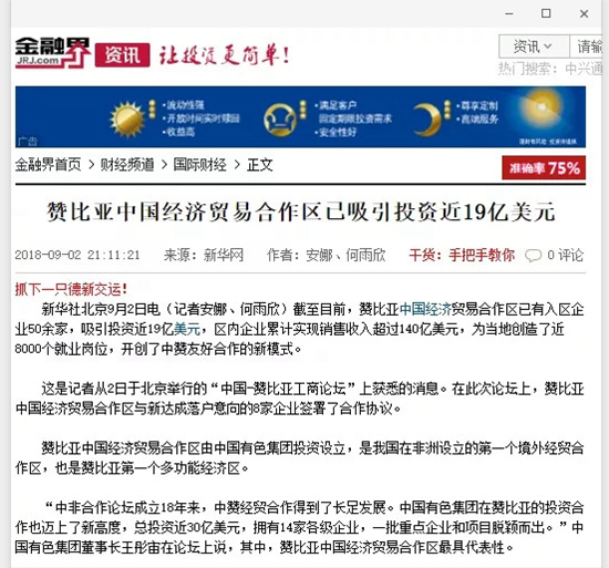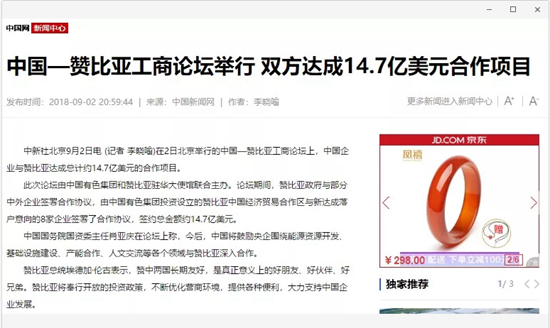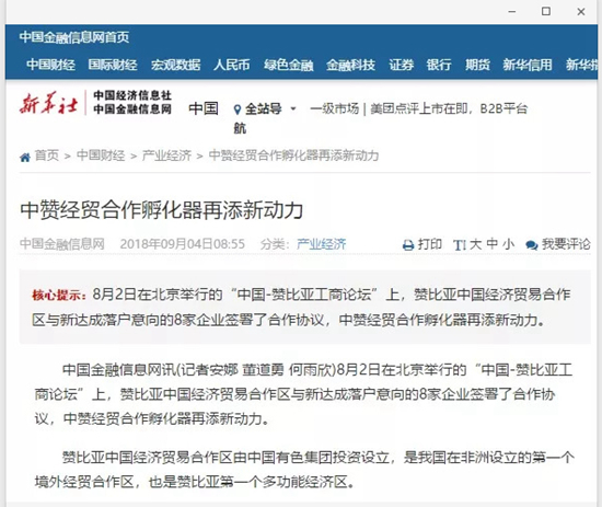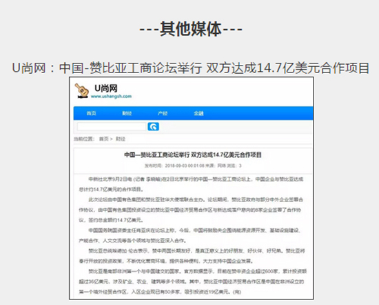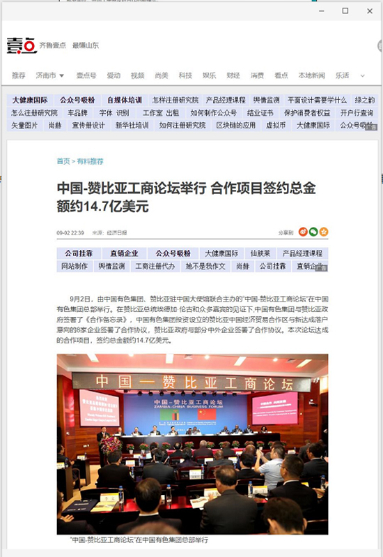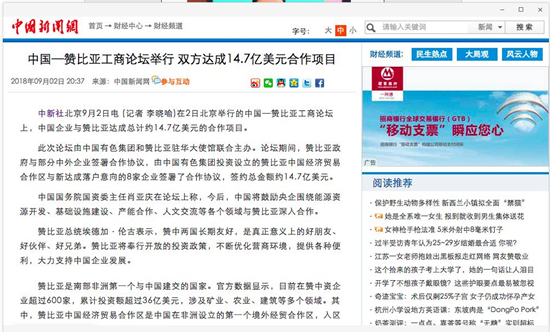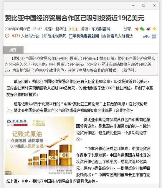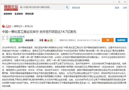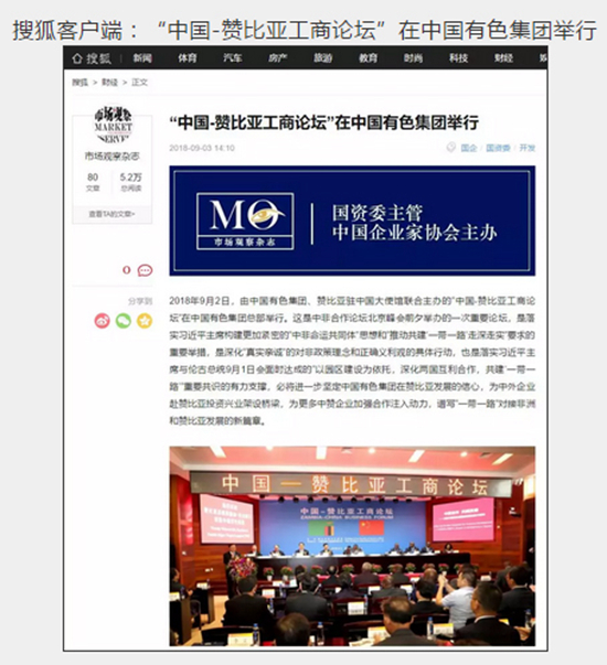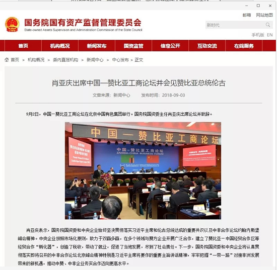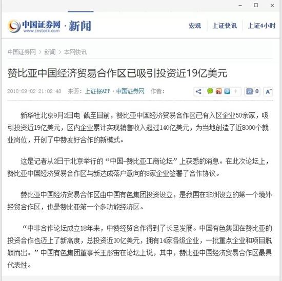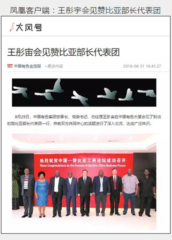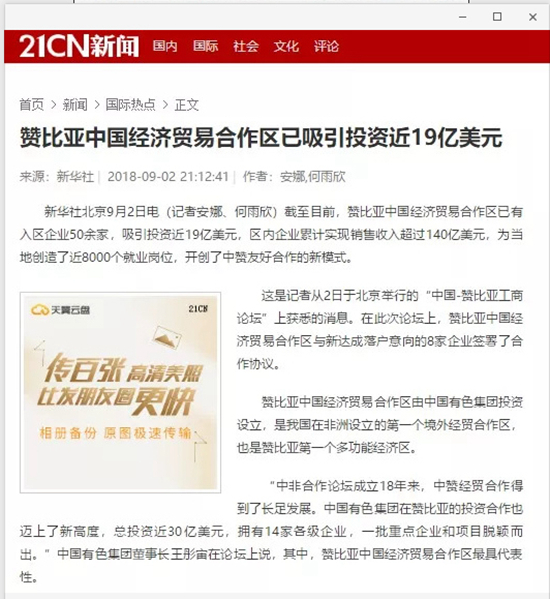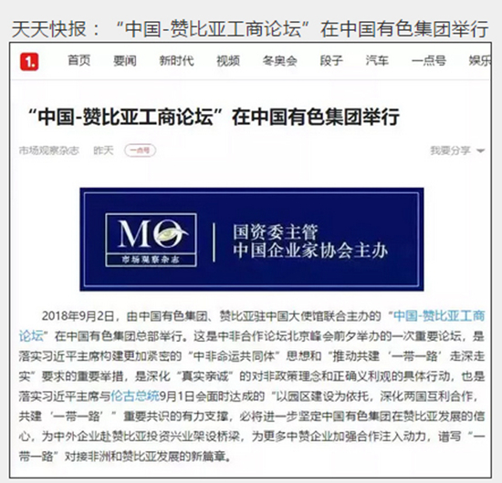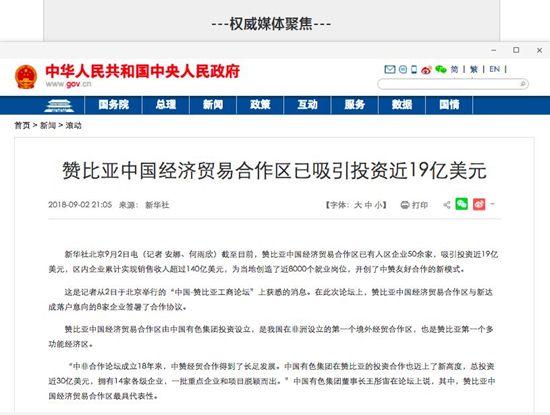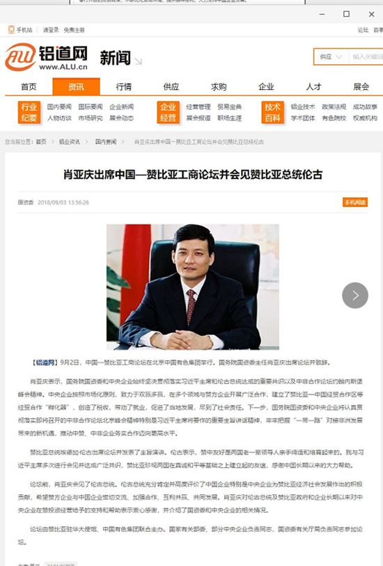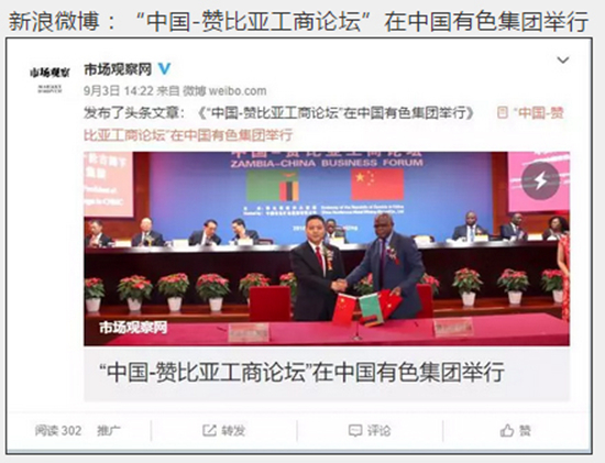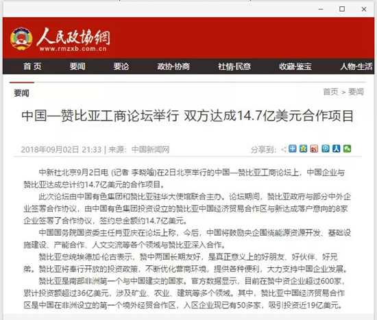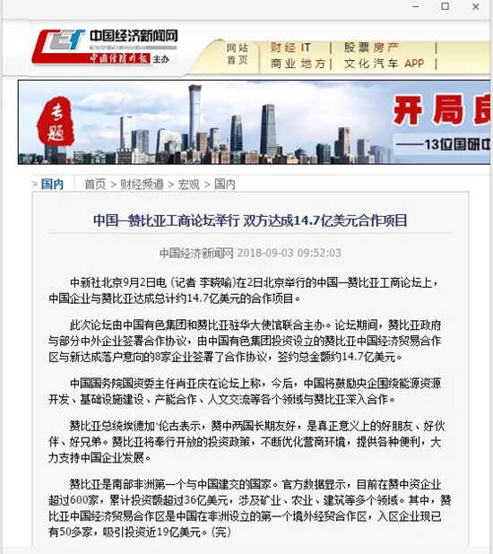2018年9月2日,由中國有色集團、贊比亞駐中國大使館聯(lián)合主辦的“中國-贊比亞工商論壇”在中國有色集團總部舉行。中非合作論壇成立18年來,中贊經(jīng)貿(mào)合作得到了長足發(fā)展。中國有色集團在贊比亞的投資合作也邁上了新高度,總投資近30億美元,擁有14家各級企業(yè),一批重點企業(yè)和項目脫穎而出。