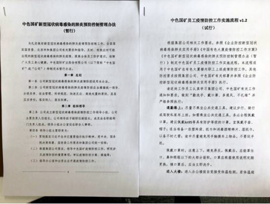 中色國礦建章立制加強疫情防控工作 中色國礦編撰了《新型冠狀病毒感染的肺炎預(yù)防控制管理辦法》和《疫情防控工作實施流程》等相關(guān)制度辦法,為節(jié)后上班疫情防控提前做好安排。面對疫情可能對生產(chǎn)經(jīng)營可能產(chǎn)生的影響,制定了工作預(yù)案,提前做好境外物資采購渠道備份溝通。積極響應(yīng)集團公司倡議,迅速組織員工捐款捐物,為疫情防控貢獻力量。
